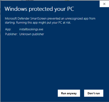 For now, press the More info link, then Run anyway. You can see the App: is installbookings.exe