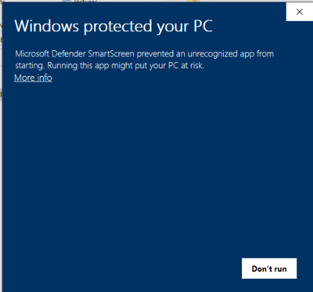 Beginning with Windows 10© the Windows Defender SmartScreen offers you an opportunity to not run a program. This is because the file isn't downloaded a lot. This does not mean it has a virus. By Microsoft's own admission it is because they are not familiar with the file.