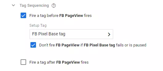 Now we have to make sure that the main FB Base pixel will be fired before this tag. To do that click on “Advanced Settings” and find “Tag sequencing”. Here make sure to add the Facebook base pixel tag to fire before this tag. Set it like this: