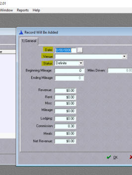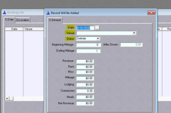 You will see Date, Venue, and Status need to be filled in. Date is the date of the Booking and can be selected by using the Calendar button. Venue and Status each are filled from
