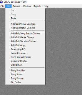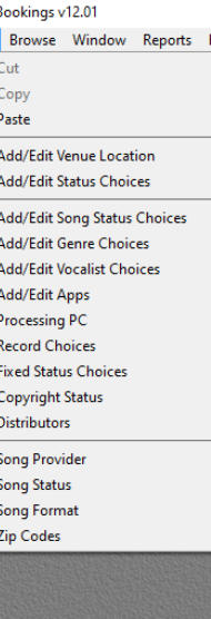 Venue and Status are selected from a ‘Drop Down’ list which MUST be filled in by the Edit Menu BEFORE you can add any gig bookings